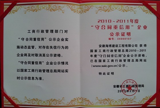 继2007-2008年度、2009-2010年度连续两届“省级守合同重信用”荣誉后,在2010-2011年度“守合同重信用”申报评选中,我公司有幸获得合肥市工商行政管理局和安徽省工商行政管理局的一致认可,推选申报“国家级守合同重信用”单位,并顺利通过国家工商行政管理总局的审查,喜获“国家级守合同重信用”殊荣。