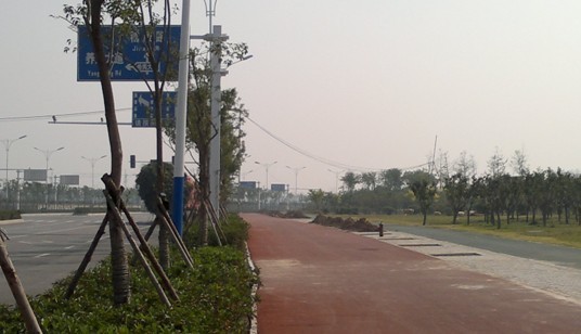 这条景观路全长1.3公里,单独红色和绿色沥青混凝土面层投资约200万元。2013年9月下旬开始施工,目前已经施工完毕。