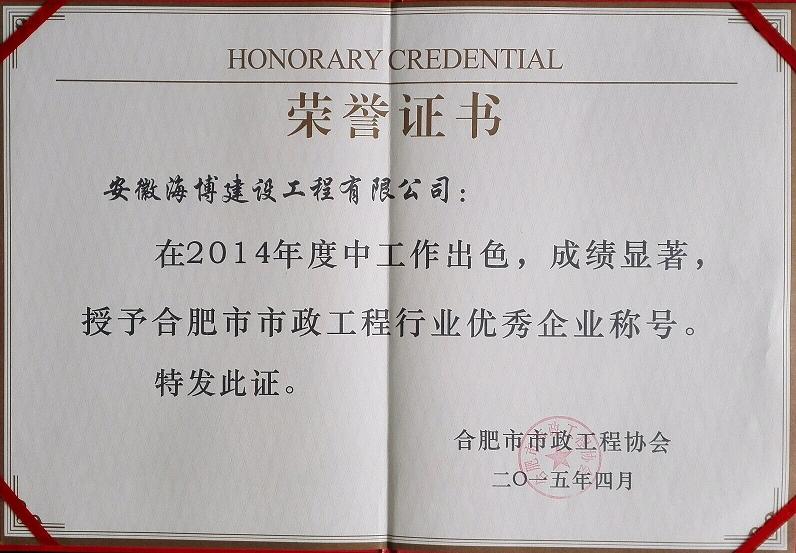 我公司一直致力于诚信发展、注重工程质量、确保安全生产,被协会评为“合肥市市政工程行业优秀企业”;同时,经过协会提议,全体会员表决,我公司顺利晋升为副会长单位。