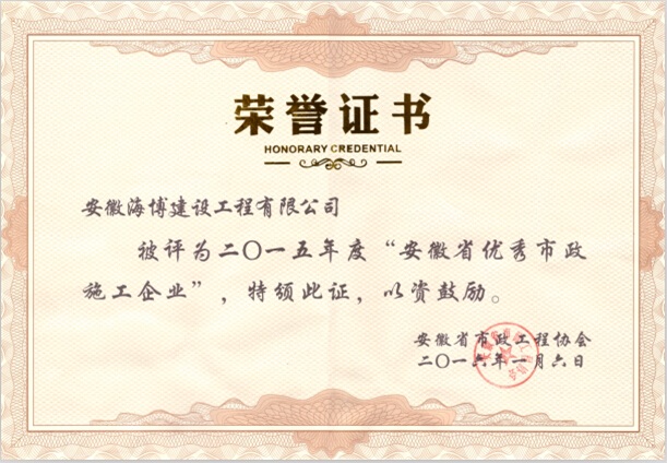 2015年度“安徽省优秀市政施工企业”评选结果于近日揭晓,此次全省共评选出40家优秀市政施工企业,热烈祝贺安徽江南网页版建设工程有限公司位列其中。