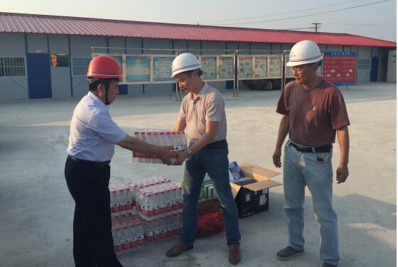 目前,已经进入高温施工期,为做好各施工现场安全生产、防暑、降温工作,有效遏制夏季各类安全生产事故和高温中暑事件发生,保障一线施工作业人员的安全、健康、清凉。公司以高度的责任感和紧迫感,由企业法人带队,深入施工现场,开展 “安全、健康、清凉”慰问活动,为一线施工作业人员送去企业的关怀和问候。同时要求各项目部,对一线施工人员的生命和健康抱以高度负责态度,把防暑降温工作落实到每一个班组、每一个工人;“抓两头、歇中间”避免中午高温期间进行室外施工作业;确保施工人员宿舍、食堂、厕所、淋浴间等临时设施满足防暑降温需求;为现场施工人员提供绿豆汤、茶水、常用防暑药品,并配备相应的急救器材;加强对饮用水、食品、食堂卫生管理,严防食物中毒事件;加强防暑降温工作检查,注重防火,排除隐患,确保安全生产。