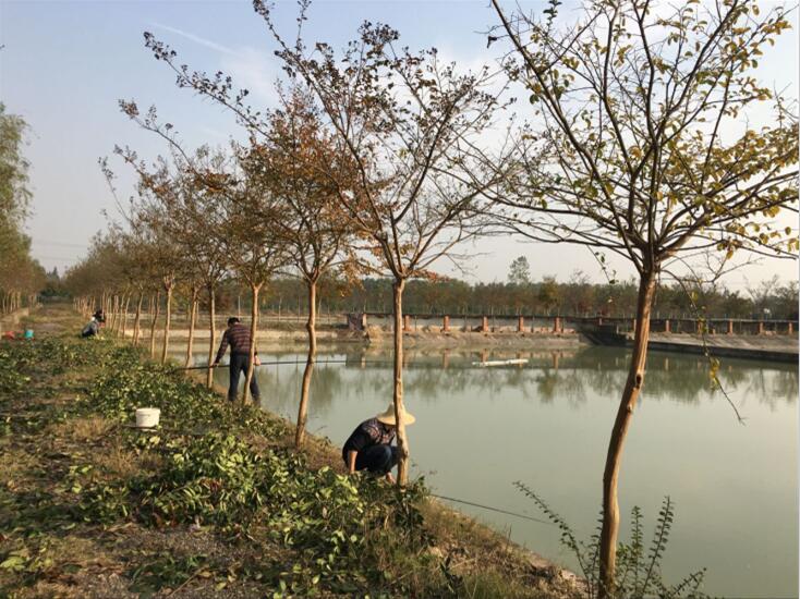 园区里几步一景,处处秋意正浓: 园区分为苗木种植观赏区、水产生态养殖区、天然垂钓体验区。苗木种植观赏区景观植物林规品种规格多,具有较高的经济价值和观赏价值:有紫薇、红叶石楠、木子李、海棠、玉兰、红枫、垂丝海棠等,不同规格树木相间,行行片片排排。微风拂面,让你闻到秋风特有的清香,树叶被秋风吹得凉爽,地上铺了一层五彩的斑斓,告诉我们这是秋的时节。园区工人很勤劳,有的在补种幼苗,有的在修剪枝叶,一遍繁忙和生机,园区也因你们身影而更美丽精彩。