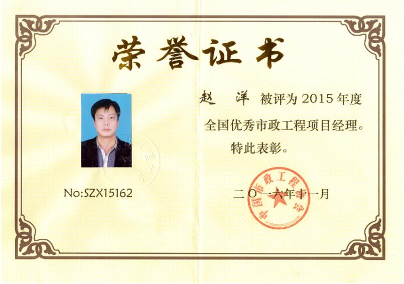 昨日,安徽省市政工程协会九届三次理事会议在庐江召开,我公司赵洋同志荣获“2015年度全国优秀市政工程项目经理”称号,全省仅有十二位同志获得此项殊荣。会上,省协会主要领导对获奖者颁发了荣誉证书。