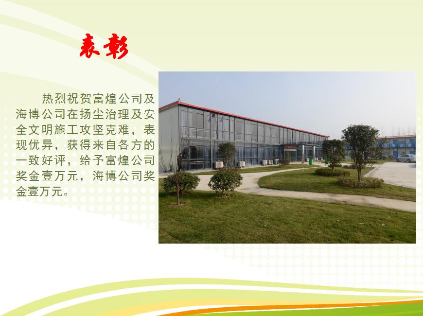 5月初,中央环保督察组进驻合肥,开展为期一个多月的水、土壤和大气污染等环保治理工作督察。海纳项目部迅速响应,积极行动,组织人员对现场安全文明施工和扬尘治理工作进行全面梳理,排查安全隐患,落实整改措施。沿施工道路设立围挡,张挂绿篱、公益广告,场区裸露土体全覆盖,配置雾炮机,栽种绿化苗木,并对门前道路、工地大门出入口、办公区、场内临时道路、土方作业面等每日定时洒水降尘。划分责任区,明确责任人,建立奖罚制度,使整个项目的施工环境上了一个台阶。