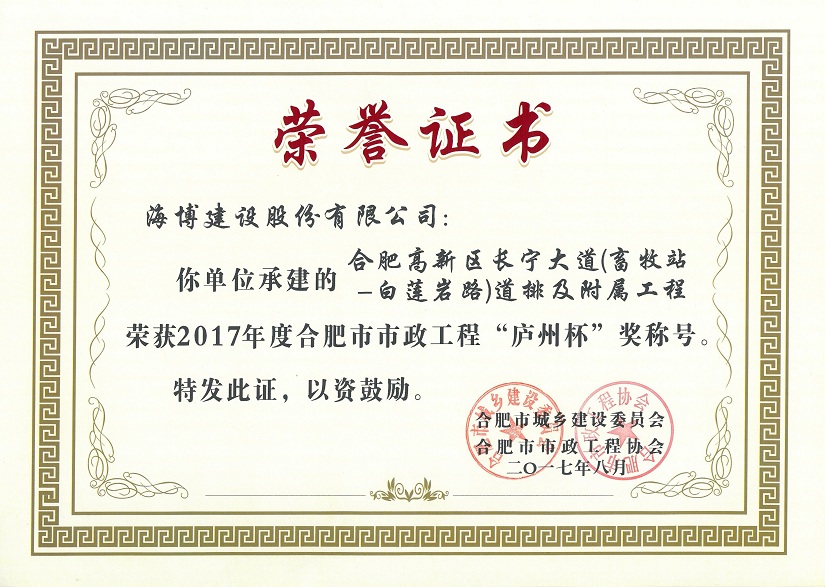 我公司承建的合肥高新区长宁大道(畜牧站-白莲岩路)道排及附属工程,荣获了2017年度合肥市市政工程“庐州杯”奖。