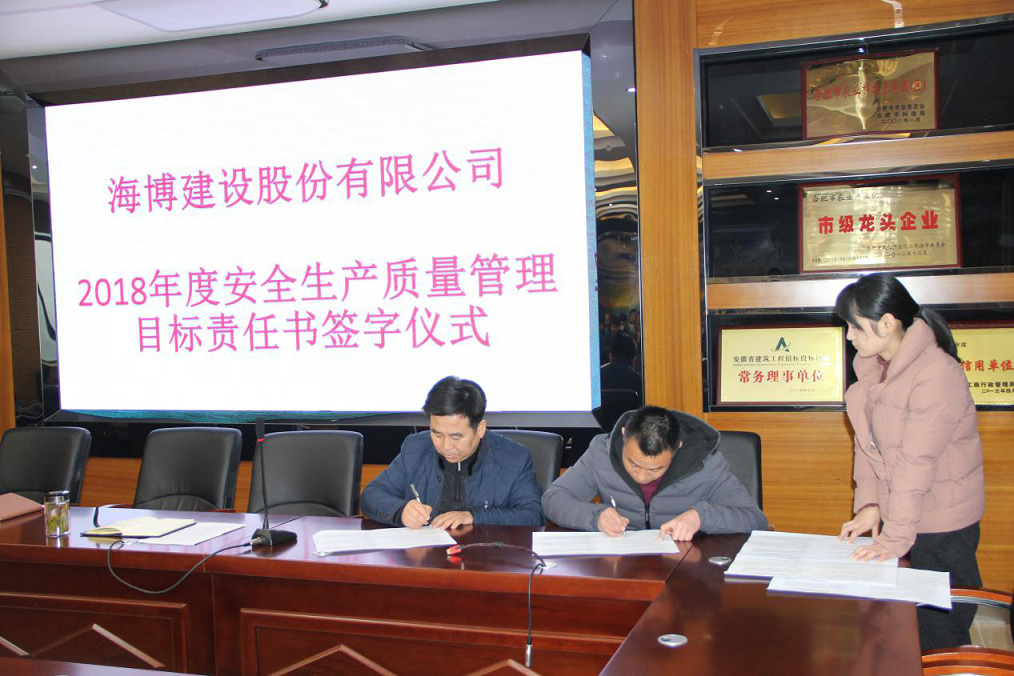 会议还组织了公司法定代表人曹成稳经理与在建项目的项目经理共同签订了“2018年度安全生产质量管理目标责任书”,并要求各项目部认真贯彻《落实全员岗位安全生产责任制实施办法通知》精神,深入开展冬季安全检查,突出重点,全面排查和整治各类事故隐患,加强重大危险源的安全监控,积极为春节和全国“两会”营造安全稳定的社会环境。
