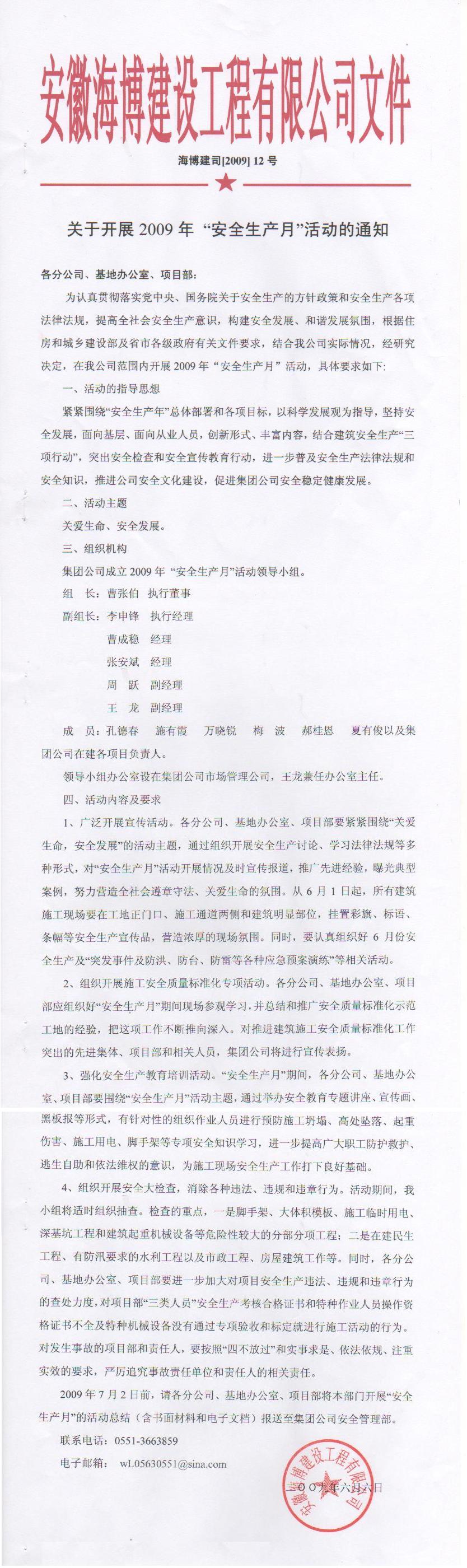 关于开展2009年 “安全生产月”活动的通知